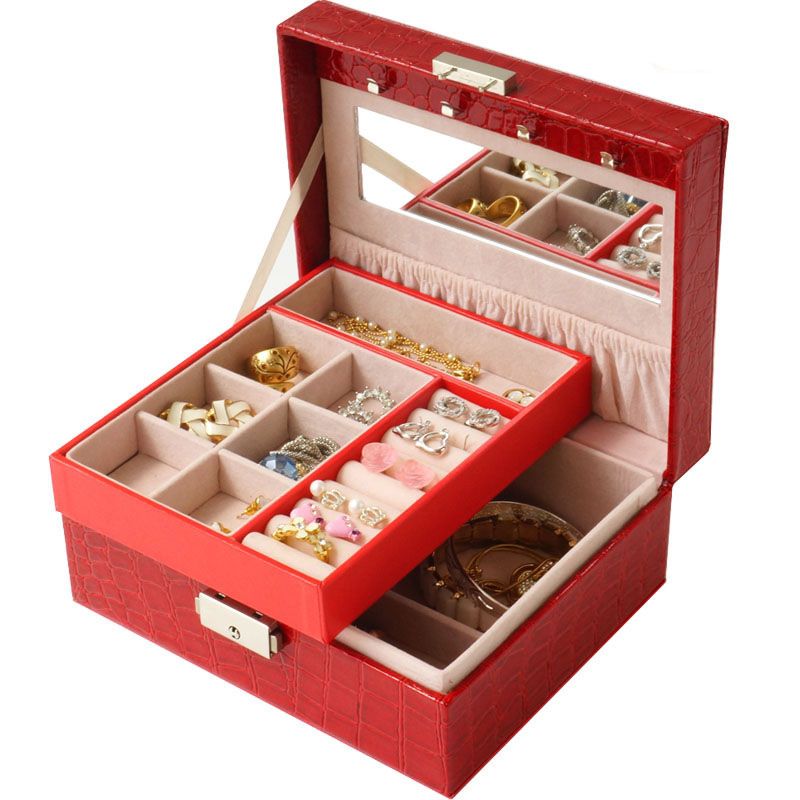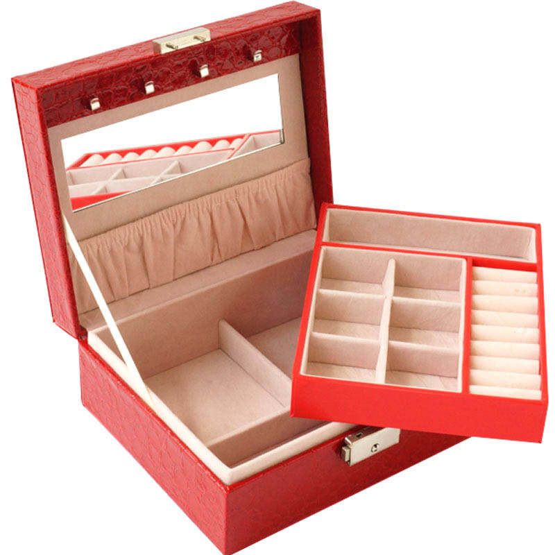 Safely store and protect your valuable necklaces, bracelets, rings and earrings with this jewelry storage box. Crafted in top quality pattern leather with matched velvet lining, this box features various compartments to meet all kinds of jewelry storage. As soon as it opened, the upper tray would be pop up and holds lots of rings.